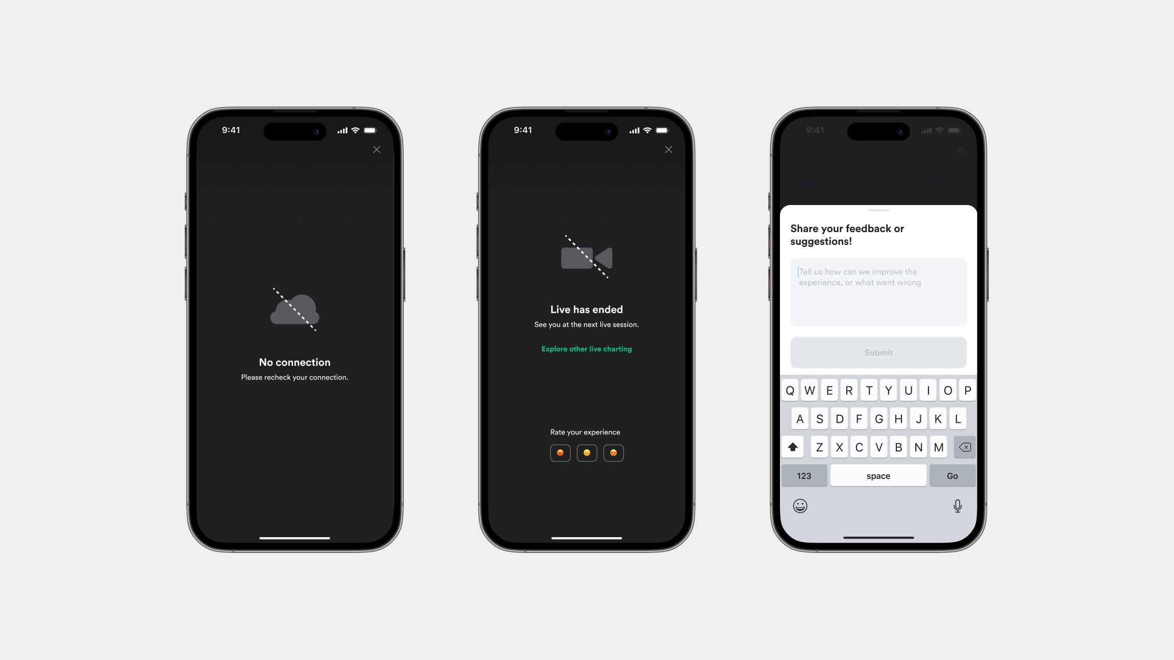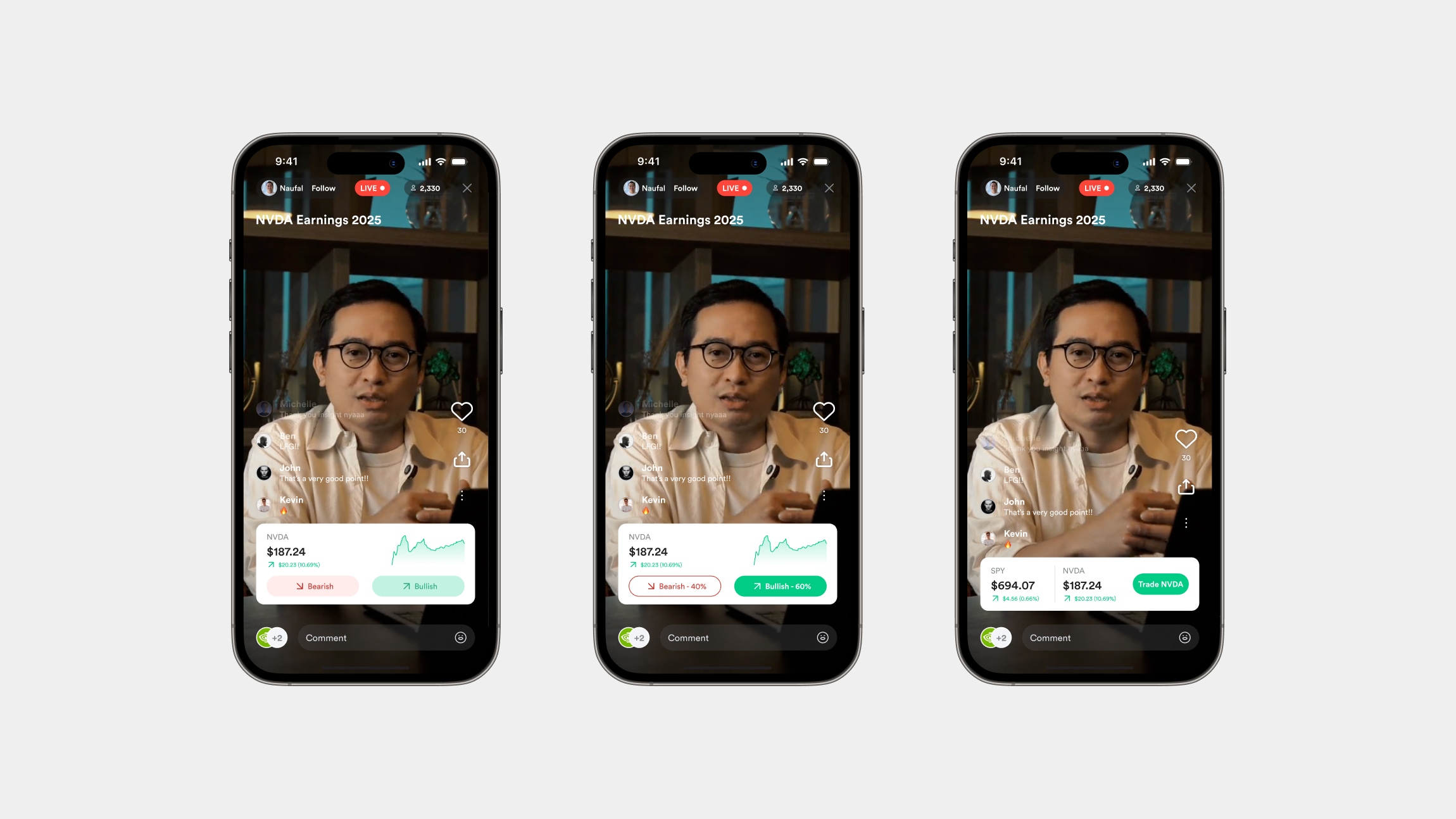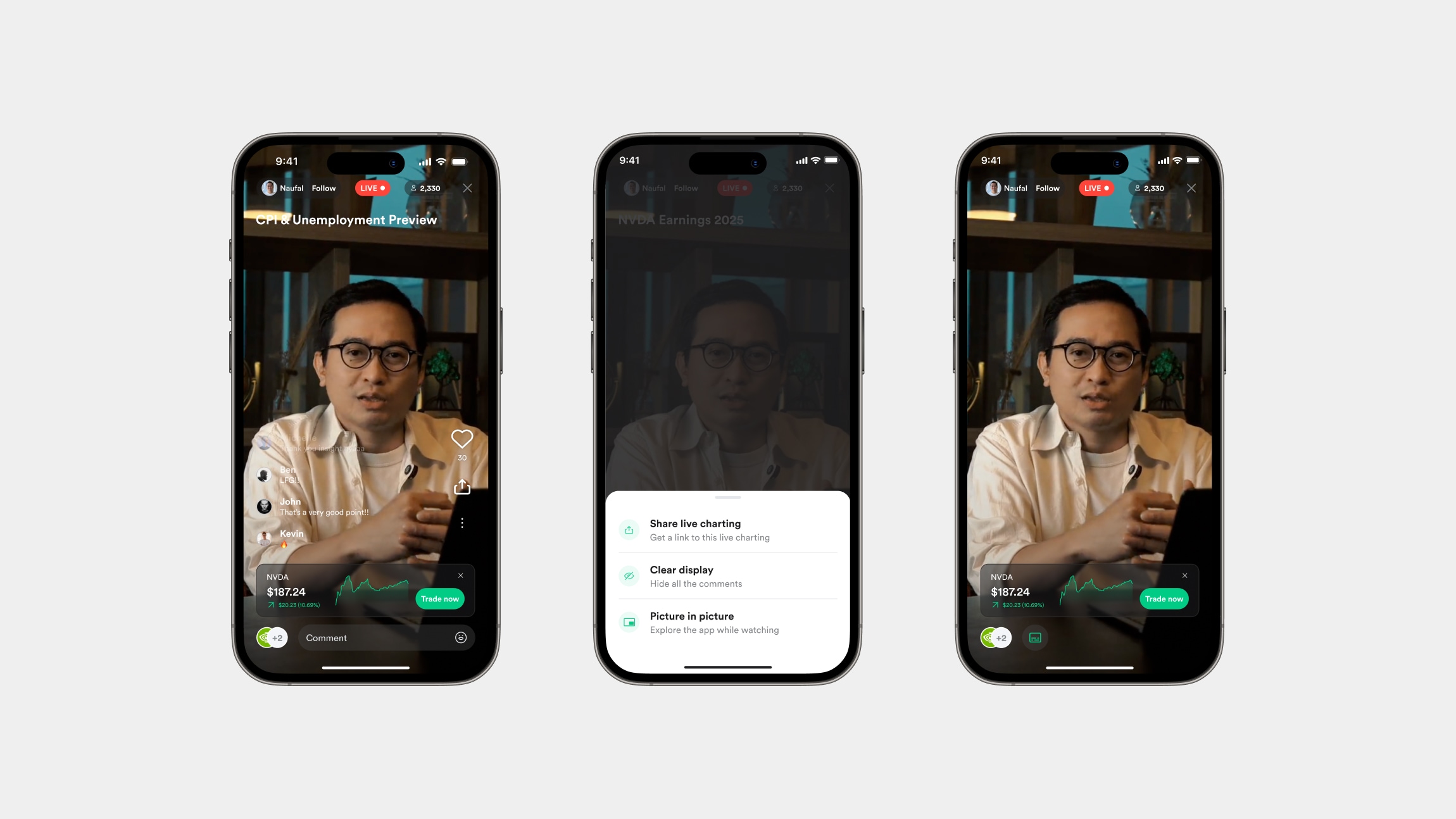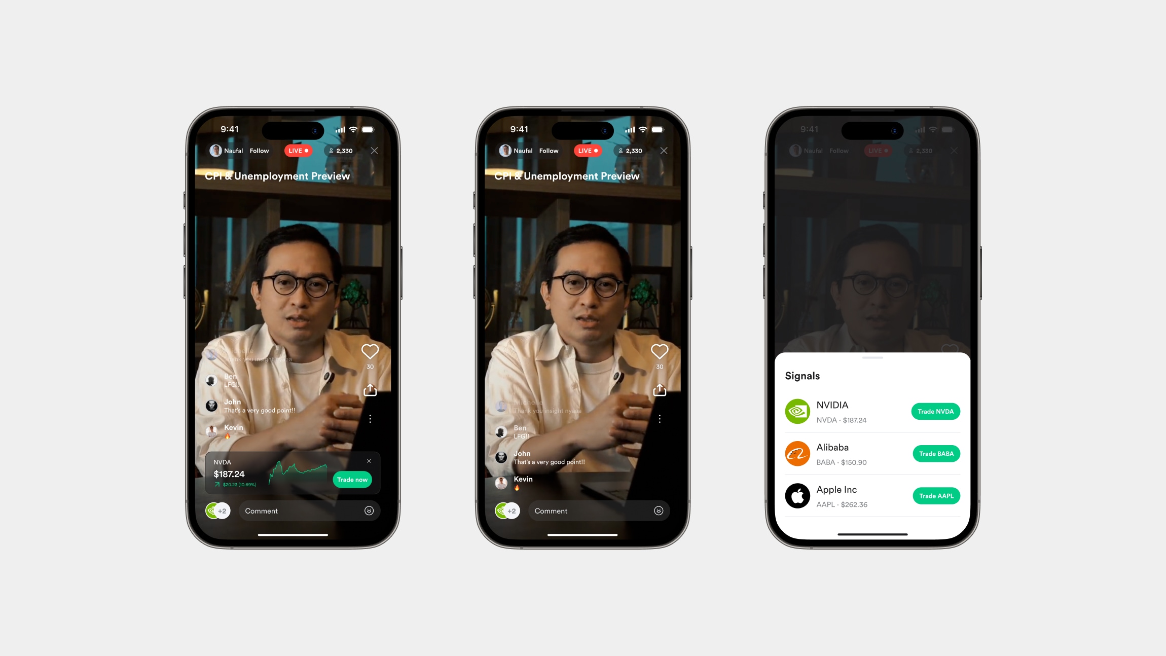 We make it easier for users to get insights by bringing a live session feature into the app. As there might be stocks that are discussed in the session, we provide a live-updated chart at the bottom, where users can easily click to trade right away.